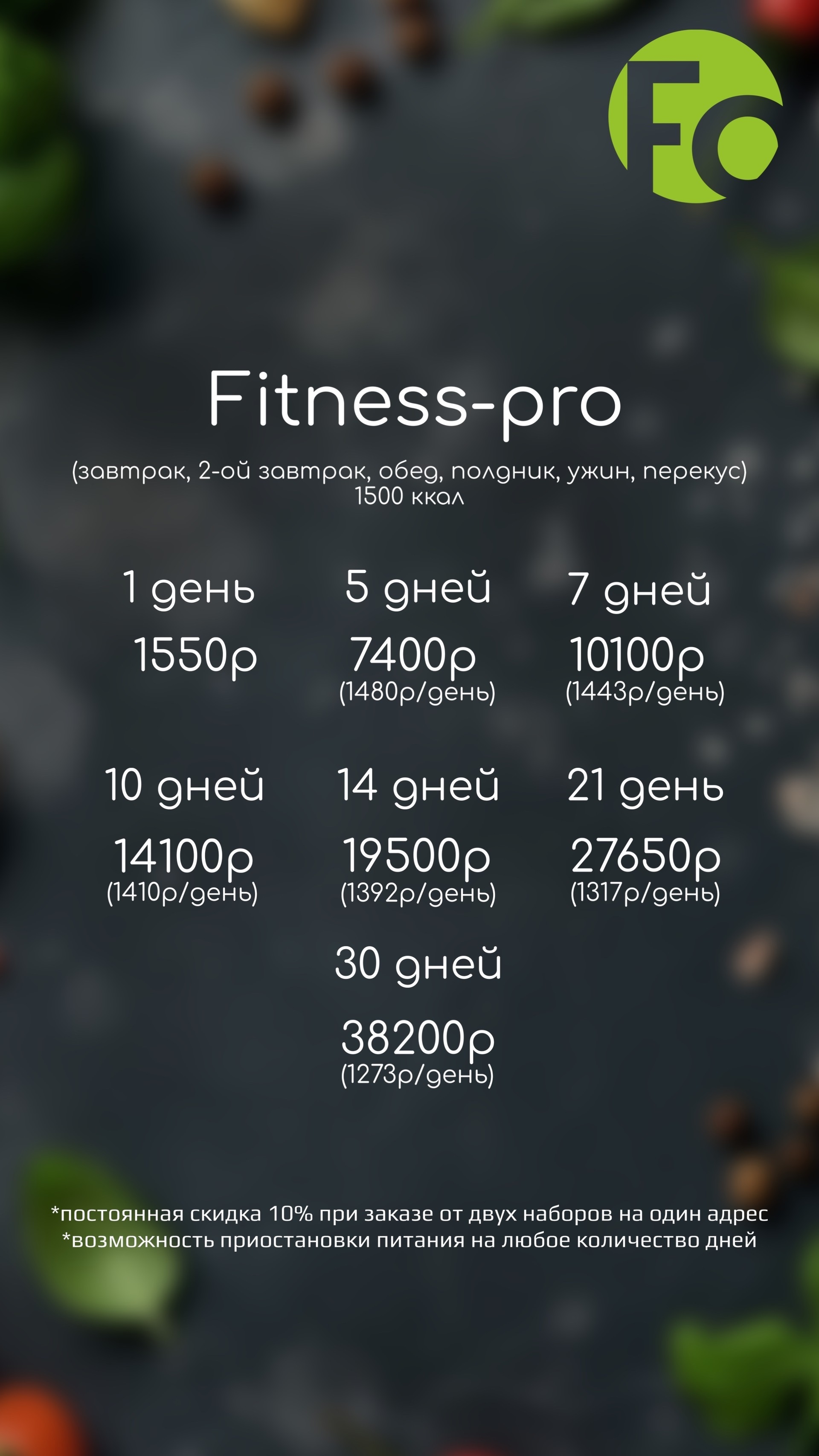 Идеально для поддержания формы. Данный комплект питания доставляется в фирменном пакете крафт. Комплект состоит из 6-ти приемов пищи, каждый из которых находится в пищевом контейнере. В таком контейнере разогревать питание можно в микроволновой печи! Приемы пищи: Завтрак, второй завтрак, обед, полдник, ужин и перекус.